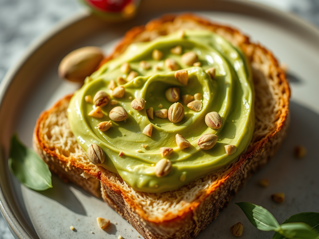 Pistachio cream is essentially a nut butter made out of pistachios. Its sweetened with sugar, and sometimes has butter or another oil added, and even sometimes white chocolate. It is very bright green color, which can make your toast look very unique and even more appetizing than plain old yellow butter or brown peanut butter. The nuts are ground very finely to make a super smooth cream, which has an absolutely delicious texture that anyone will love.