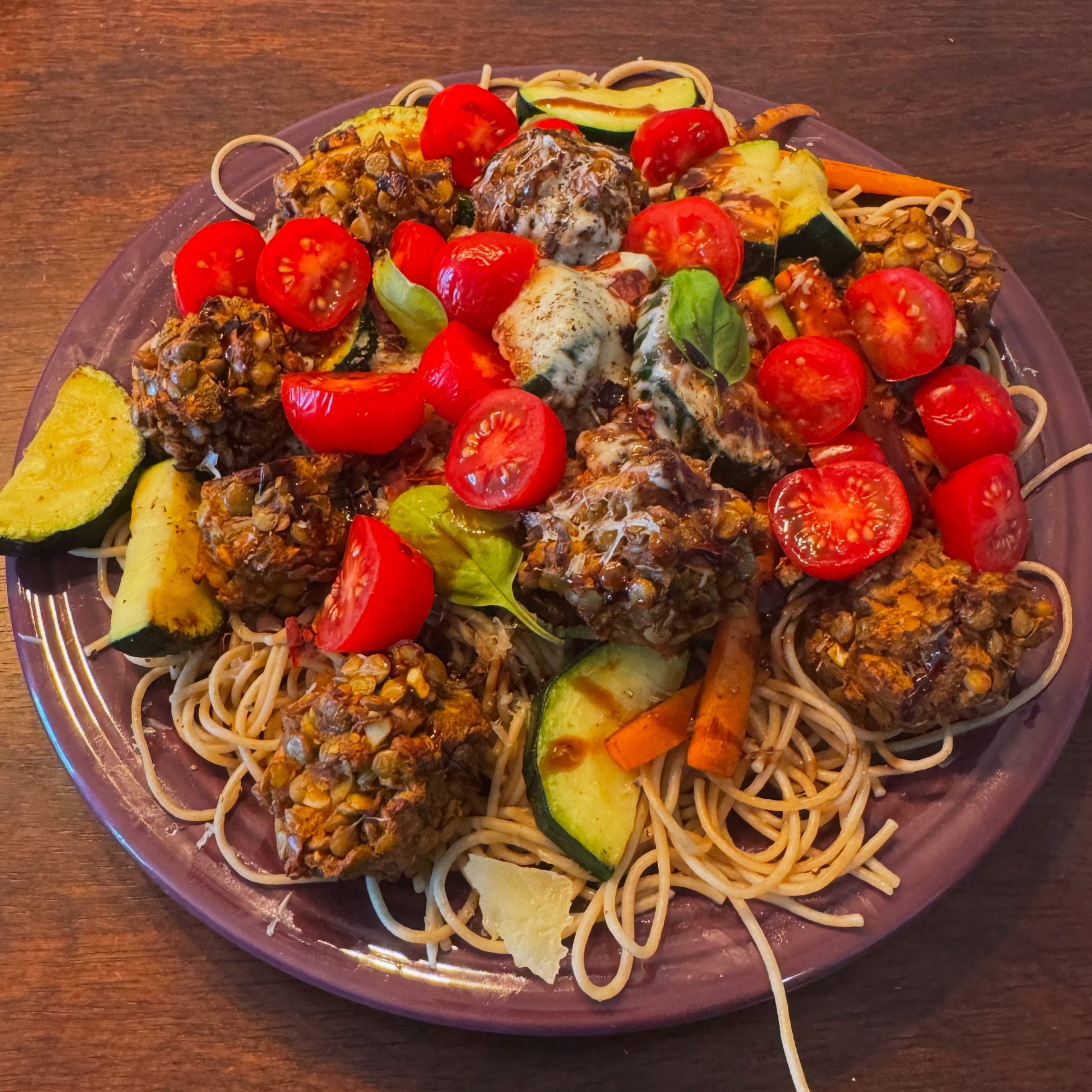 You won’t believe that the meatballs in these spaghetti and meatballs aren’t actually made of meat! Seitan is a vegan meat substitute made from vital wheat gluten. It’s less common because people with gluten intolerance or celiac can’t eat it. It’s got a great, chewy texture which is perfect for meatballs, and is high-protein and high in iron. It usually is boiled for an hour, but it can actually be mixed and steamed in only 15 minutes, which you can do while the pasta is cooking. If you make the seitan with 1/4 cup of vital wheat gluten, and put it on 2 oz of whole wheat spaghetti, you’d get 31 grams of protein.