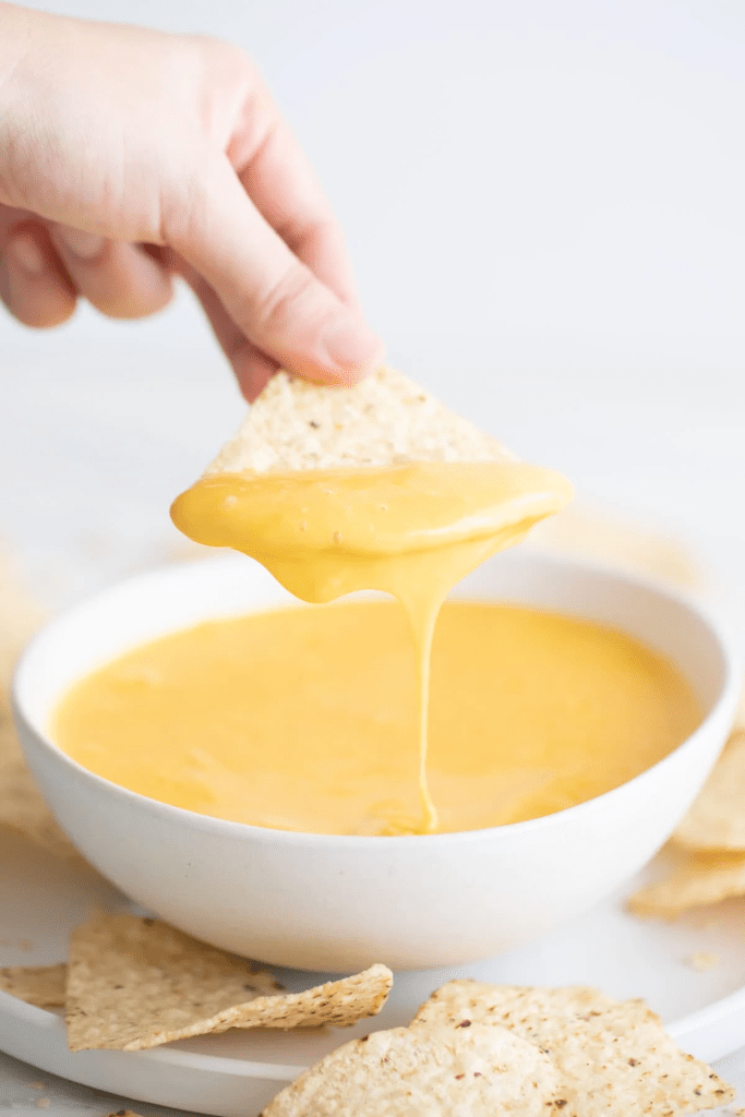 Let me start by saying this cheese sauce is absolutely delicious. I mean, it’s seriously so good on everything; pasta, nachos, tacos, etc. What makes this cheese sauce so good is the nutritional yeast. This sauce contains the perfect amount of it, so it’s not too strong, but just right to where you get that cheesy flavor. And the texture is just heavenly. It’s so smooth, you wouldn’t believe that it contains potatoes and carrots. And it’s got a bright golden color, reminiscent of nacho cheese.