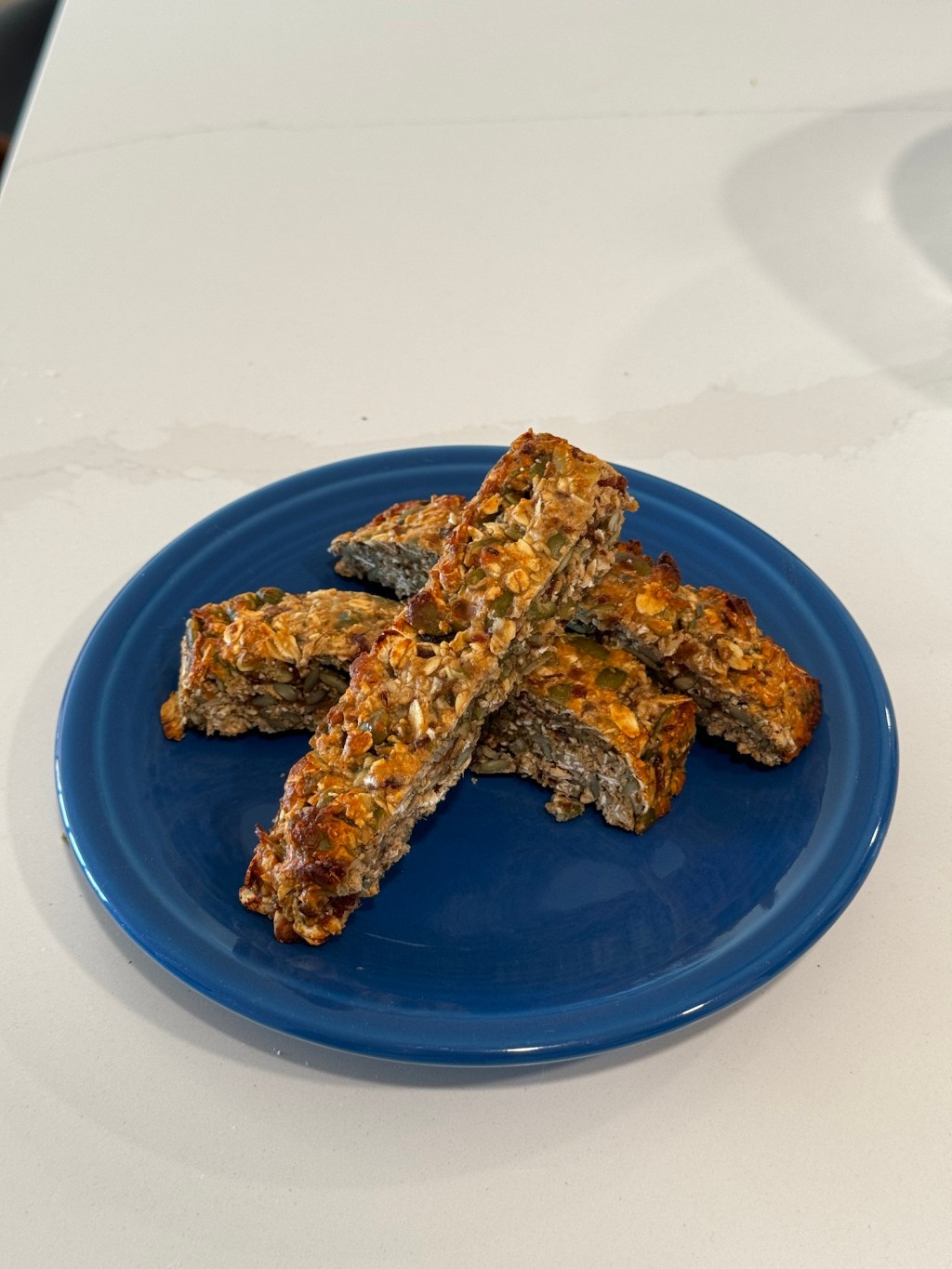 Remove the sheet from the oven and allow the cooked batter to cool for 5-10 minutes, then cut it into 8 granola bar-sized rectangles. I suggest putting them in the freezer to get them to firm up, but you can keep them in the refrigerator if you want softer bars. Save them for after a workout, or whenever you need a quick pick-me up. You’ll love them!