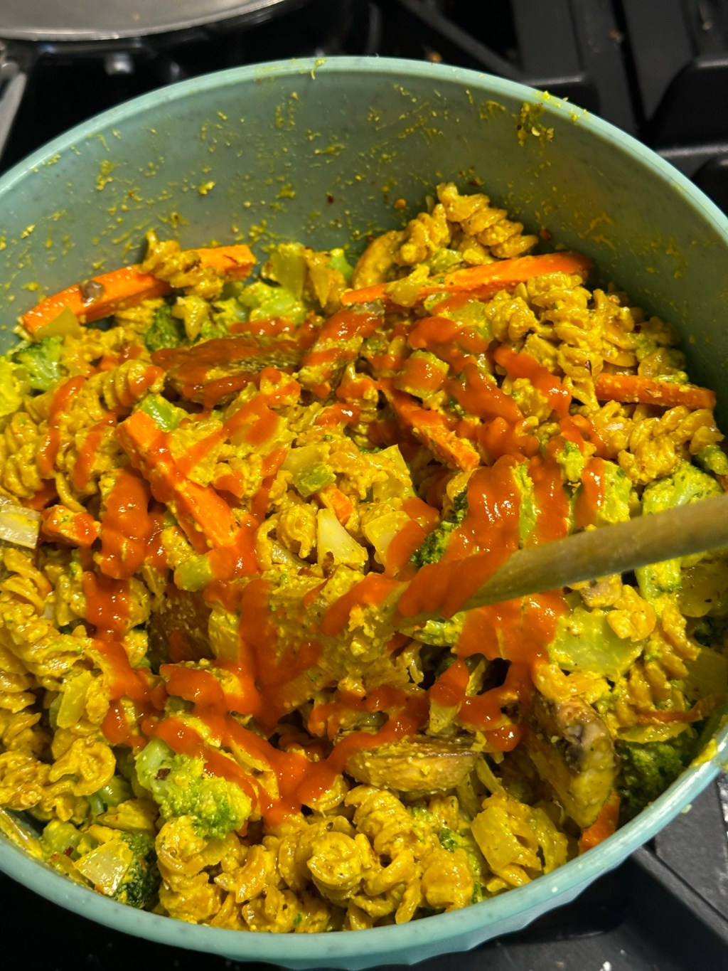Cook the frozen broccoli in the microwave according to its package directions, and once it is cooked add it to the veggie bowl. Finally, add the pasta to the veggies, and stir until everything is combined. Add sriracha sauce to give it a spicy, tasty kick, and enjoy!